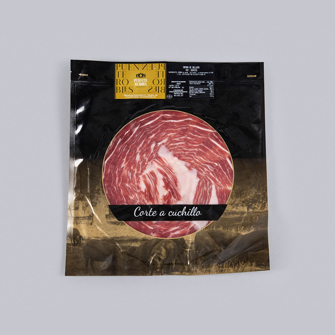 Packets of 100% iberian breed acorn-fed iberian ham from the hind legs of 100% purebred Iberian pigs.