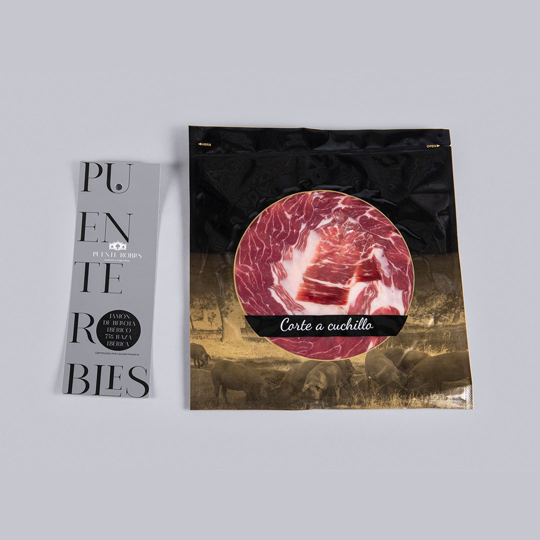 Packets of 75% iberian breed acorn-fed iberian ham obtained from the hind legs of 75% purebred Iberian pigs.