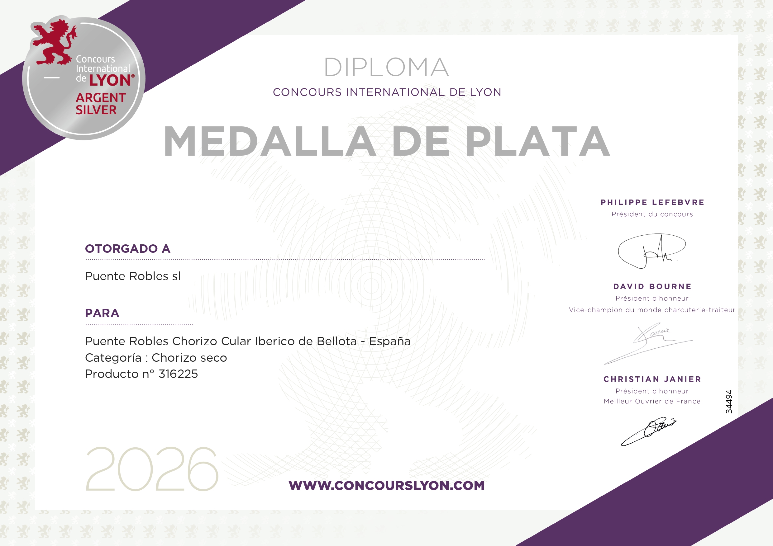 En 2025, Puente Robles ya fue protagonista en Lyon gracias a la calidad de sus elaboraciones ibéricas. Este 2026 reafirma ese camino: dos años consecutivos consiguiendo medallas en uno de los concursos más prestigiosos del mundo.