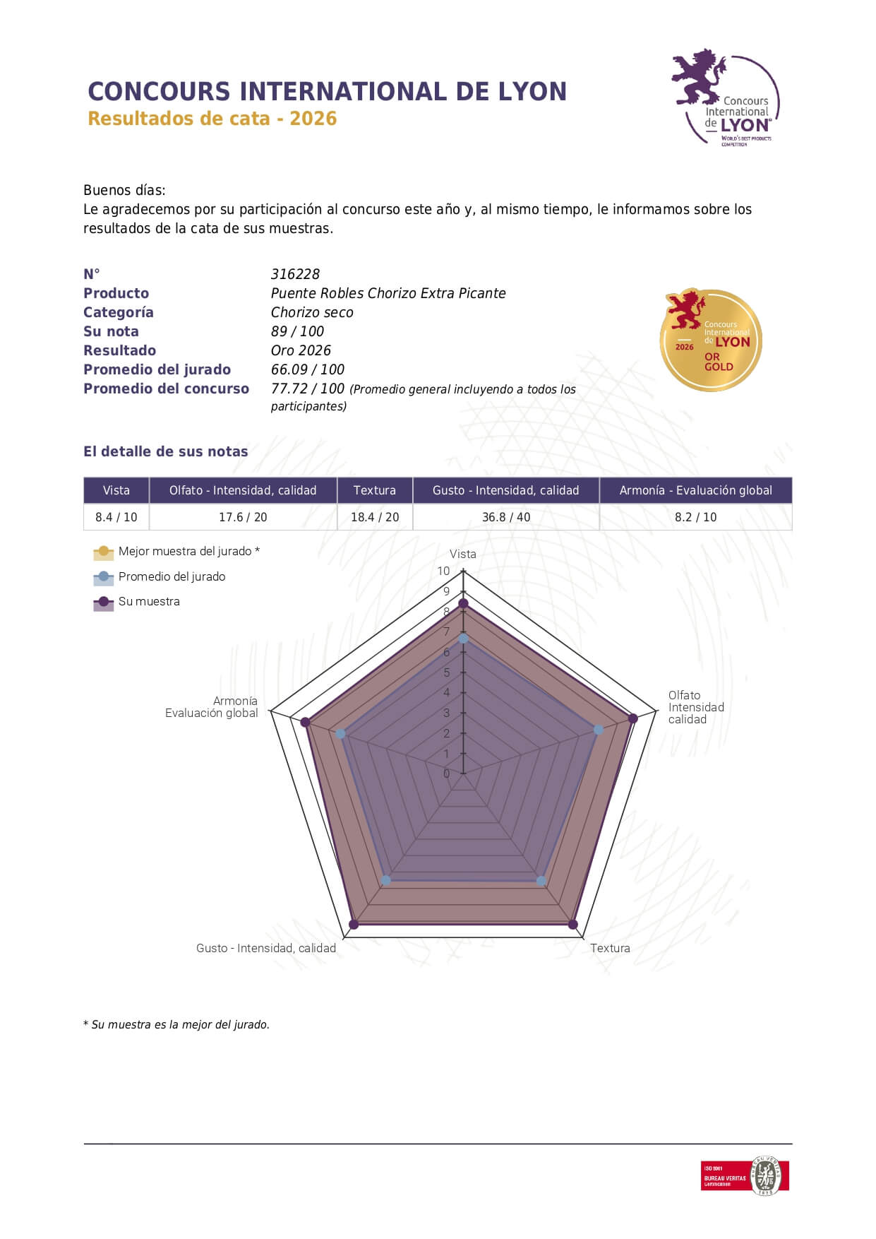 El jurado otorgó a nuestro Chorizo Extra Picante una puntuación de 89/100, muy por encima del promedio general del concurso (77,72/100). Además, fue valorado como la mejor muestra del jurado.