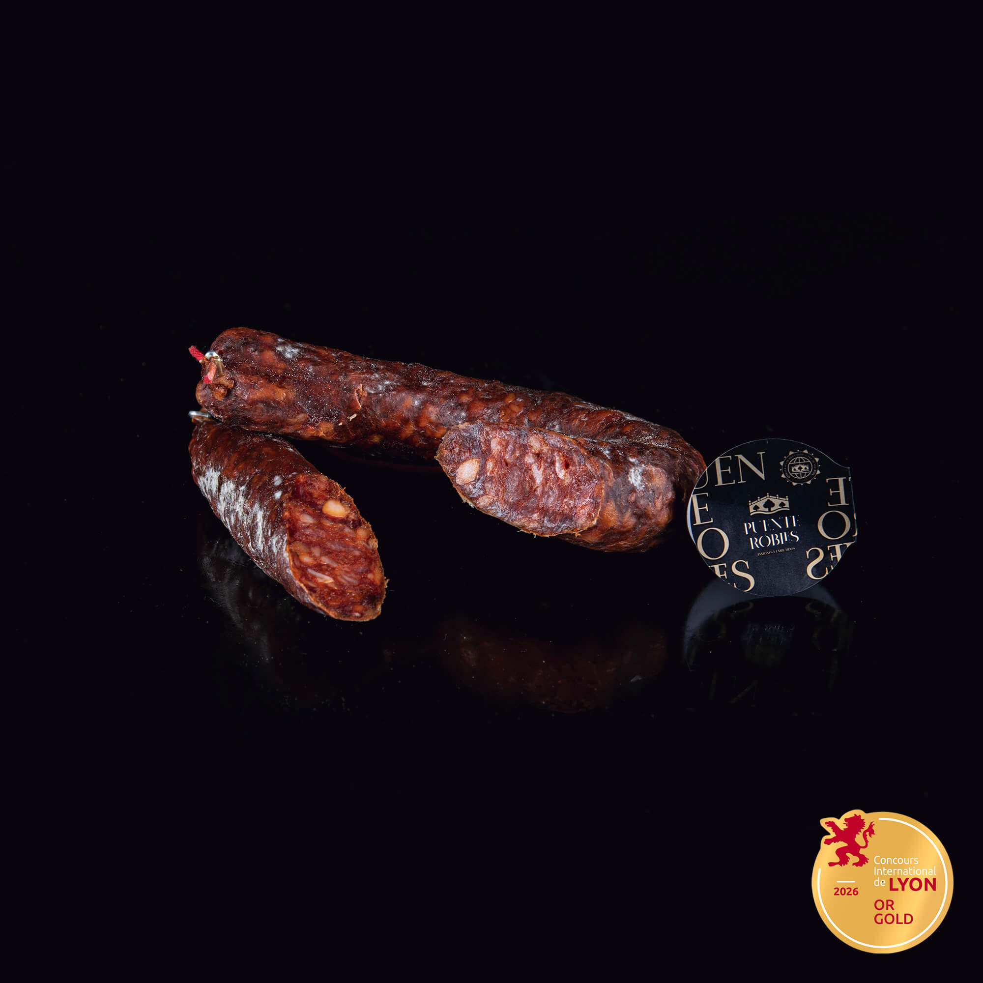 Un chorizo que destaca por su intensidad aromática, su curación lenta y su sabor redondo a un chorizo de bellota de calidad. Un chorizo premiado con la Medalla de Oro en 2025 y Medalla de Plata en 2026 que puedes comprar aquí.