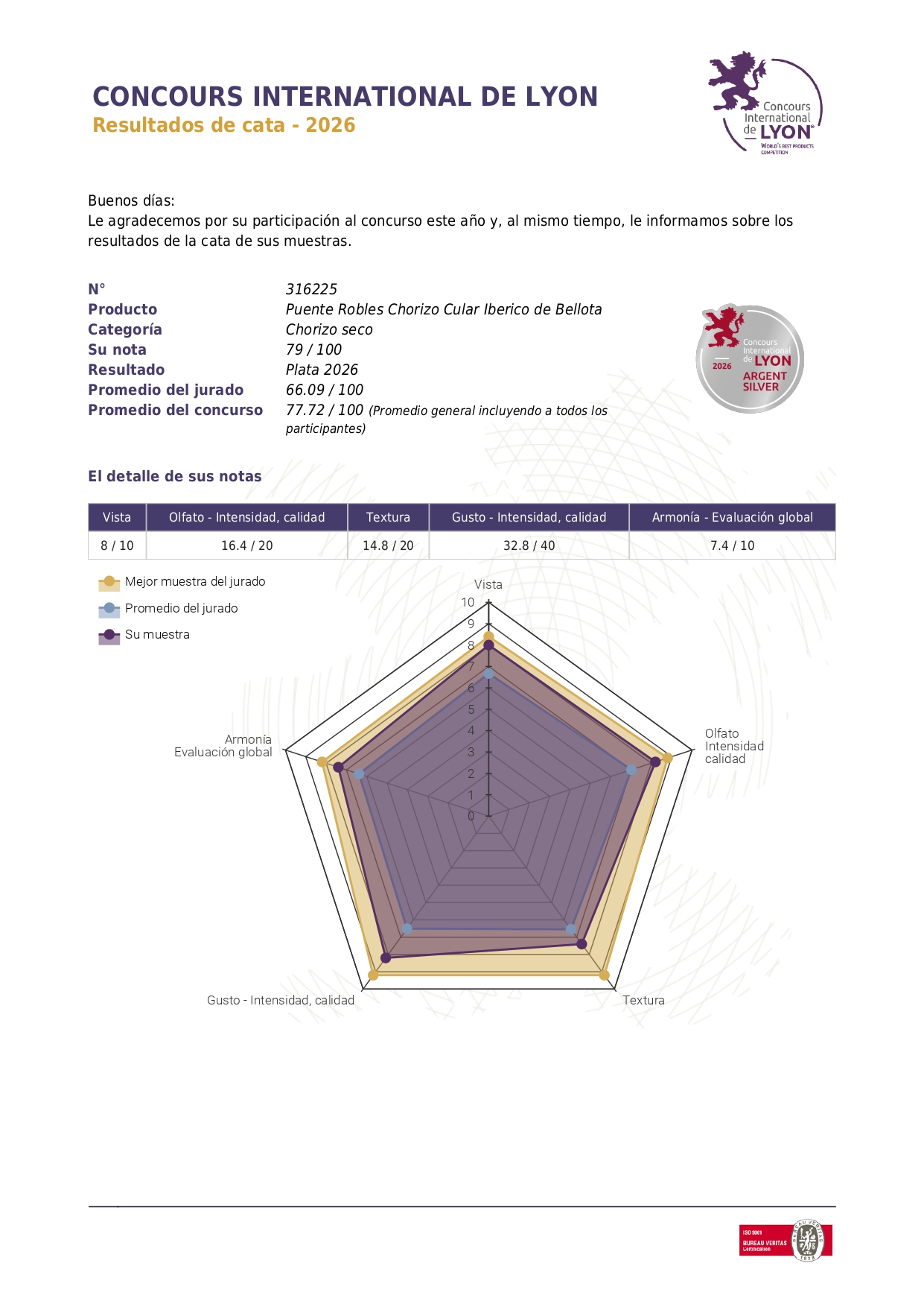 Un clásico que vuelve a enamorar al jurado. El Chorizo Cular de Bellota de Puente Robles ha logrado una puntuación de 79/100, superando el promedio del jurado (66,09/100). Un resultado que vuelve a situarlo entre los chorizos de bellota más reconocidos del panorama internacional con la Medalla de Plata.