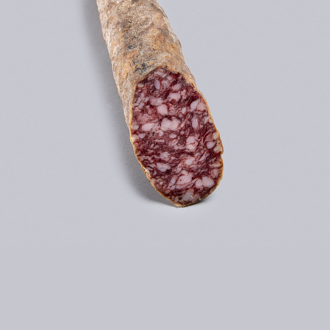 Esta Salchichón Cular de Bellota es el resultado de una cuidadosa crianza de cerdos ibéricos con una alimentación basada en hierbas silvestres y bellotas, lo que le confiere su sabor inigualable y su textura.
